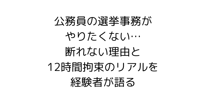 「公務員なら選挙事務は当たり前」そう言われるけど、正直こう思っていませんか? 本音ではやりたくない 休日が丸ごと潰れる 体力も気力も削られる でも断れない空気がある そして一番つらいのが、「やりたくないと思う自分がおかしいのか?」と悩んでしま... -