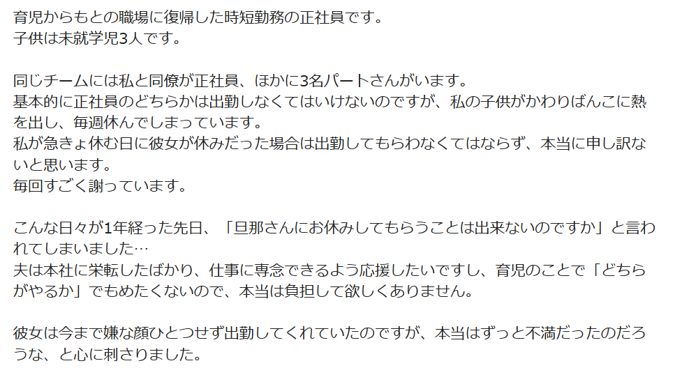 時短勤務で子供がいて突発的に休むのは致し方ないとしても、職場の人の善意にただ乗りしている態度がむかつくんです。